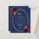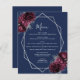 Cet élégant menu mariage moderne présente un cadre géométrique argenté décoré de bouquets floraux bordeaux et argentés sur un arrière - plan bleu marine. Le texte personnalisable combine écriture fantaisie gris argenté, cuivre et polices italiques.