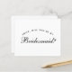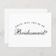 A simple, minimalist bridesmaid proposal: just black text on white background. The word Bridesmaid on the front and the message on the back are written in an elegant calligraphic script, the arched text "[Name] will you be my" above the word Bridesmaid in small caps.