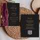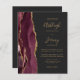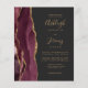 Save the cost of printing and mailing separate RSVP cards with this elegant modern all-in-one budget wedding invitation. The left-hand edge features a burgundy watercolor agate border trimmed with gold faux glitter. The customizable text combines gold-colored handwriting, copperplate and italic fonts on a slate black background. The reverse side provides space for wedding details on a solid slate black background, along with a QR code guests can scan to visit your website and RSVP.