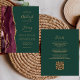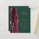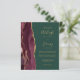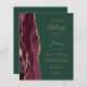 Save the cost of printing and mailing separate RSVP cards with this elegant modern all-in-one budget wedding invitation. The left-hand edge features a burgundy watercolor agate border trimmed with gold faux glitter. The customizable text combines gold-coloured handwriting, copperplate and italic fonts on an emerald green background. The reverse side provides space for wedding details on a solid emerald green background, along with a QR code guests can scan to visit your website and RSVP.