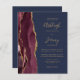 Save the cost of printing and mailing separate RSVP cards with this elegant modern all-in-one budget wedding invitation. The left-hand edge features a burgundy watercolor agate border trimmed with gold faux glitter. The customizable text combines gold-coloured handwriting, copperplate and italic fonts on a navy blue background. The reverse side provides space for wedding details on a solid navy blue background, along with a QR code guests can scan to visit your website and RSVP.