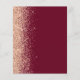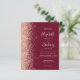 The left-hand edge of this elegant modern wedding invitation features a peach faux glitter border. The customizable text combines pale peach handwriting, copperplate and italic fonts on a burgundy background. The reverse side features a matching peach glitter and burgundy design.