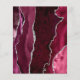 The left-hand edge of this elegant modern wedding invitation features a burgundy red watercolor agate border trimmed with faux silver glitter. The customizable text combines silver grey script and sans serif fonts on a navy blue background. The reverse side features a matching burgundy and silver agate design.