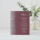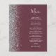 The left-hand edge of this elegant modern wedding menu features a silver faux glitter border. The customizable text combines silver grey handwriting script and copperplate fonts on a dark burgundy background. The reverse side features a matching burgundy and silver design.