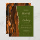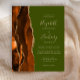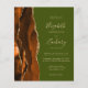 The left-hand edge of this elegant modern wedding invitation features a burnt orange and brown watercolor agate border trimmed with faux gold glitter. The customizable text combines tan handwriting, copperplate and italic fonts on an olive green background. The reverse side features a matching agate design.