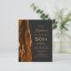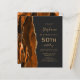 The left-hand edge of this elegant modern 50th birthday party invitation features a burnt orange watercolor agate border trimmed with gold faux glitter. The customizable text combines gold-coloured handwriting, copperplate and italic fonts on a slate black background. The reverse side features a matching burnt orange and gold agate design.