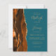 The left-hand edge of this elegant modern wedding invitation features a burnt orange watercolor agate border trimmed with faux gold glitter. The customizable text combines gold-coloured handwriting, copperplate and italic fonts on a teal blue background. The reverse side features a matching agate design.