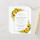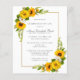 Elegant celebration of a life invitation features two yellow sunflowers and white daisy floral arrangements decorating a gold frame. The deceased person's name is written in a traditional script text. All of the text can be easily edited to create a personal remembrance.
