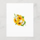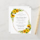 Elegant celebration of a life invitation features two yellow sunflowers and white daisy floral arrangements decorating a gold frame. The deceased person's name is written in a traditional script text. All of the text can be easily edited to create a personal remembrance.