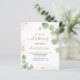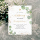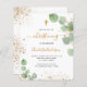 A white background decorated with eucalyptus greenery and faux gold glitter dust. Personalize and the childs name and ceremony details. Black and golden coloured letters. Gender neutral.