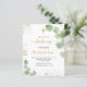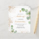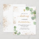A white background decorated with eucalyptus greenery and faux gold glitter dust. Personalize and the childs name and ceremony details. Black and golden coloured letters. Gender neutral.