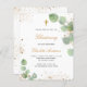 A white background decorated with eucalyptus greenery and faux gold glitter dust. Personalize and the childs name and ceremony details. Black and golden coloured letters. Gender neutral.