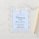 Faux silver metallic and light blue coloured background decorated with faux silver glitter dust. Personalize and add a name and the details. Black coloured letters.