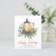 Elegant budget-friendly seasonal greeting card featuring a watercolor illustration of a Christmas candle lantern in an arrangement of seasonal pines, eucalyptus, berries and greenery. "Happy Holidays" is written in a contemporary red script and you can personalize your name in simple modern typography.