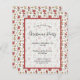 White background decorated with red Cardinals, poinsettia, drinks.    With the text: Christmas Party written with modern and trendy large hand lettered style script. Personalize and add your party details.
