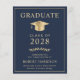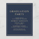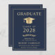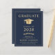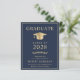 Elegant and budget-friendly blue college graduation announcement and party invitation with a gold grad cap and modern light gold typography for the graduate's name, class year, college or university, degree and major or honours.