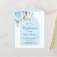 A white background decorated with eucalyptus greenery, a light blue rose, and golden leaves and a blue arch frame. Personalize and a name and ceremony details. Elegant hand lettered style script.
