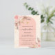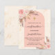 An arch frame and rose gold marble print as background. Decorated with rose gold and pink florals, roses and pampas grass. Personalize and add a name and details.