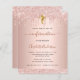 A rose gold faux metallic looking background. Decorated with rose gold, pink faux glitter drips, paint dripping look. Personalize and add a name and details. The name is written with a hand lettered style script