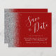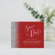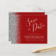 This elegant budget save the date card features a silver faux glitter border. The customizable text combines silver grey handwriting script, copperplate and italic fonts on a crimson red background. The reverse side features a matching crimson and silver design.