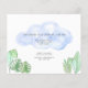 This budget boy's baby shower invitation is decorated with a smiling baby sloth hanging from a branch, framed with green watercolor jungle leaves and blue clouds.