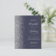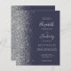 The left-hand edge of this elegant modern wedding invitation features a silver faux glitter border. The customizable text combines pale silver grey handwriting, copperplate and italic fonts on a dark blue background. The reverse side features a matching dark blue and silver design.