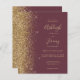 The left-hand edge of this elegant modern wedding invitation features a gold faux glitter border. The customizable text combines gold-colored handwriting, copperplate and italic fonts on a dark burgundy background. The reverse side features a matching dark burgundy and gold design.