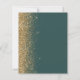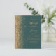 The left-hand edge of this elegant modern wedding invitation features a gold faux glitter border. The customizable text combines gold coloured handwriting, copperplate and italic fonts on a dark green background. The reverse side features a matching dark green and gold glitter design.