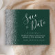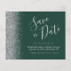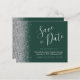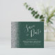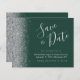 This elegant budget save the date card features a silver faux glitter border. The customizable text combines silver grey handwriting script, copperplate and italic fonts on a dark emerald green background. The reverse side features a matching emerald green and silver design.