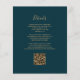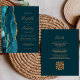 The left-hand edge of this elegant modern wedding invitation features a teal watercolor agate border trimmed with faux gold glitter. The customizable text combines gold coloured handwriting, copperplate and italic fonts on a dark teal background. The reverse side provides space for wedding details on a solid teal background, along with a QR code guests can scan to visit your website and RSVP.