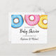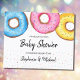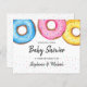 This cute baby shower invitation features watercolor doughnuts in pink, blue and yellow.