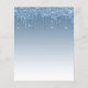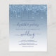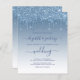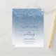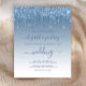 A chic, modern design featuring a blue ombre background with a top border of blue glitter drips. The word "wedding" and the couple's first names appear in lowercase calligraphy script with decorative swashes at the beginning and end, with the remaining text in sans serif font. The blue ombre background and glitter drip border are repeated on the reverse. (To keep the swashes, replace only the letters, leaving the symbols in place.)