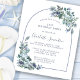 Dusty blue peonies and wildflowers decorate a pretty birthday invitation. Modern calligraphy and the arch add to the Boho Vibe.