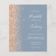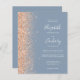The left-hand edge of this elegant modern wedding invitation features a peach faux glitter border. The customizable text combines white handwriting, copperplate and italic fonts on a dusty blue background. The reverse side provides space for wedding details on a solid dusty blue background, along with a QR code guests can scan to visit your website and RSVP, which saves the cost of printing and mailing separate RSVP cards.