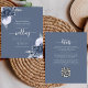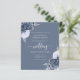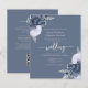 This elegant wedding invitation features dusty blue floral bouquets set off with silver faux foil greenery in two corners, on a dusty blue background. The customizable text combines silver grey serif, italic and handwriting fonts. The reverse side provides space for wedding details, along with a QR code guests can scan to visit your website and RSVP.