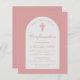 An invitation for a girl's confirmation. On a dusty rose (dark pink) background, it has a white arch with dusty rose text inside. The word Confirmation and the name are written in an elegant calligraphic script; the first line is arched text.