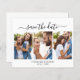 Budget Simple Elegant Calligraphy Script 3-Photo Collage Wedding Save The Date Cards in Black and White. This exquisitely delicate design is tailored precisely for contemporary weddings, exuding an enchanting romantic appeal. Highlighting a graceful 3-photo grid collage and whimsical calligraphy in a hand-lettered swash tail font, these cards symbolize modern elegance. Effortlessly customize them with your treasured wedding details and pictures, offering an affordable yet refined touch to announce your special day.