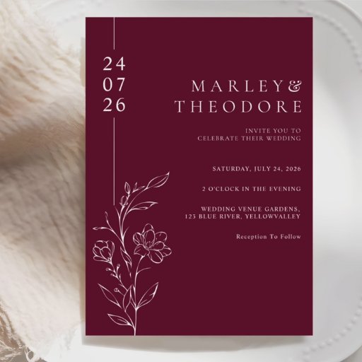 This thank you note card features chic sketched floral line art on a deep burgundy background. The clean white typography adds a modern and polished look. It is a budget-friendly option for couples who want a modern and stylish theme without extra cost. All text is easy to customize with your own message and names.