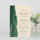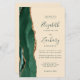 The left-hand edge of this elegant modern wedding invitation features an emerald green watercolor agate border trimmed with faux gold glitter. The customizable text combines green handwriting, copperplate and italic fonts on a champagne beige background. Add additional details on the back, along with a QR code to help your guests visit your wedding website.