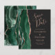 The left-hand edge of this elegant modern wedding save the date card features an emerald green watercolor agate border trimmed with faux rose gold glitter. The customizable text combines rose pink handwriting, copperplate and italic fonts on a slate black background. The reverse side features a matching emerald green and rose gold agate design. NOTE: Envelopes are not automatically included with these budget invitations, so please remember to choose the "blank white envelopes" option!