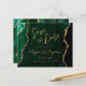 This elegant wedding save the date card features a background image of emerald green watercolor agate trimmed with faux gold glitter. The customizable text combines gold-coloured modern handwriting, copperplate and italic fonts. The reverse side features a coordinating emerald green and gold agate design.
