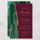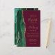 The left-hand edge of this elegant modern wedding invitation features an emerald green watercolor agate border trimmed with faux gold glitter. The customizable text combines gold-colored handwriting, copperplate and italic fonts on a burgundy red background. The reverse side features a matching emerald green and gold agate design.
