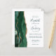 The left-hand edge of this elegant modern wedding invitation features an emerald green watercolor agate border trimmed with faux gold glitter. The customizable text combines whimsical handwriting script, copperplate and italic fonts in emerald green on a white background. The reverse side provides space for wedding details on a solid white background, along with a QR code guests can scan to visit your website and RSVP.