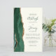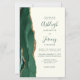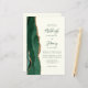 Save the cost of printing and mailing separate RSVP cards with this elegant modern all-in-one budget wedding invitation. The left-hand edge features an emerald green watercolor agate border trimmed with gold faux glitter. The customizable text combines green handwriting, copperplate and italic fonts on an ivory background. The reverse side provides space for wedding details, along with a QR code guests can scan to visit your website and RSVP.