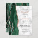 The left-hand edge of this elegant modern wedding invitation features an emerald green watercolor agate border trimmed with faux rose gold glitter. The customizable text combines dusty rose handwriting with black copperplate and italic fonts on a grey and white marble background. The reverse side features a matching emerald green and rose gold agate design.