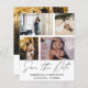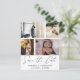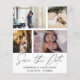 Élégant enregistrer notre date faire-part. Ce modèle dispose d'espace pour 4 de vos photos de couple préférées en blanc avec calligraphie manuscrite cool en gris foncé.. Facile à éditer avec vos propres détails uniques.