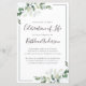 This celebration of life invitation with its watercolor eucalyptus greenery can be personalized with details of the event.