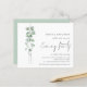 A value for money BUDGET alternative on a smaller size 4.5 x 5.6” semi-gloss 110lbs weight, which is of similar thickness to a postcard (however is not suitable to use as a postcard.). PLEASE NOTE there is ONE invite per sheet. Budget Eucalyptus Evening Party Wedding Invitation. Minimalist botanical style to invite your evening wedding guests. A set handwritten script for Evening Party and the rest of the text you can easily personalise. An elegant branch of watercolor eucalyptus leaves runs down the left hand side.