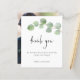 Elégant Merci photo Eucalyptus Feuille Script. Un prix économique PETIT 4,5 po x 5,6 po alternatif. Disponible dans un STOCK SEMI-GLOSS 110 lb CARD qui est l'option par défaut (plus épais pour les invitations), OU un STOCK SATIN FINISH 80 lb THINNER PAPER (idéal pour les boîtiers). Les enveloppes sont en option et légèrement plus grandes que la taille de la carte. Une élégante branche de feuilles d'eucalyptus verts coule en partie du côté droit, avec un Merci de typographie serti dans un style manuscrit moderne. Sur le dos, changez votre photo préférée de votre jour (orientation portrait). Le reste du texte sur le devant vous pouvez facilement personnaliser à vos propres mots.