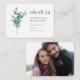 Invitations amis et famille pour enregistrer la date pour votre mariage avec cette carte économique avec des feuilles d'eucalyptus aquarelle. La photographie des modèles est à des fins d'illustration et peut être changée en une de vos propres. **VEUILLEZ LIRE AVANT DE COMMANDER** Si vous modifiez la forme ou la taille ou choisissez un autre produit et que le design est recadré de quelque façon que ce soit ou ne semble pas sur la page, vous devrez utiliser le service de design en direct pour que quelqu'un vous adapte la disposition, sauf si vous êtes à l'aise de le faire vous-même. Il n'y a pas de vérification manuelle ou d'intervention entre le placement de la commande et l'impression, donc ce que vous voyez à l'écran est ce qui vous sera imprimé et expédié. Dans cet esprit, veuillez également triple-vérifier pour toute erreur d'orthographe ou information incorrecte avant de passer votre commande.
